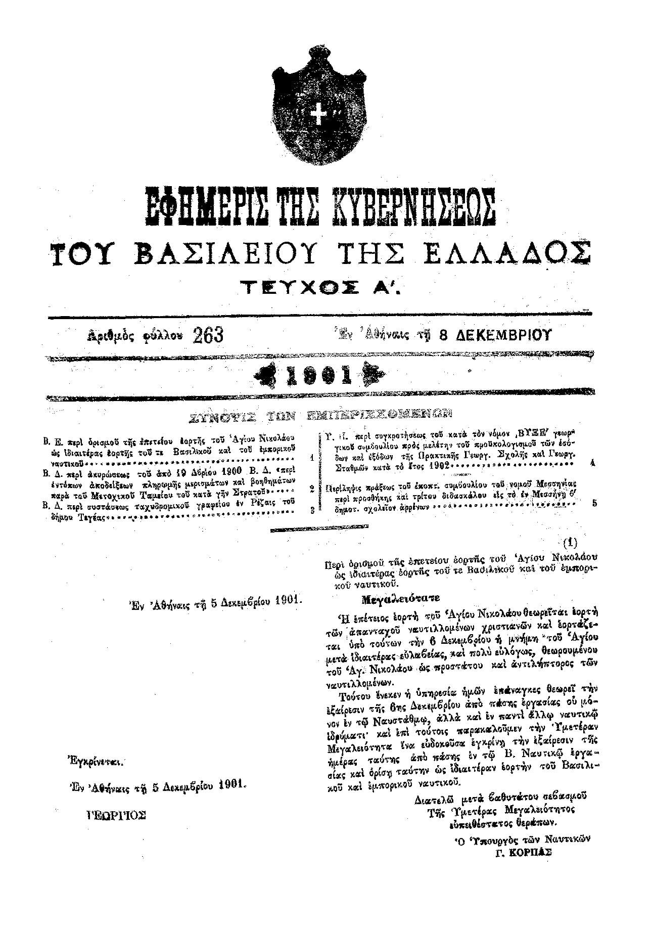 Αξίζει να σημειωθεί ότι 119 χρόνια πριν, το 1901, ο τότε βασιλιάς Γεώργιος είχε με βασιλικό διάταγμα καθιερώσει την εορτή του Αγίου Νικολάου ως πολιούχου και προστάτη του Πολεμικού Ναυτικού (πηγή: Ellinis).