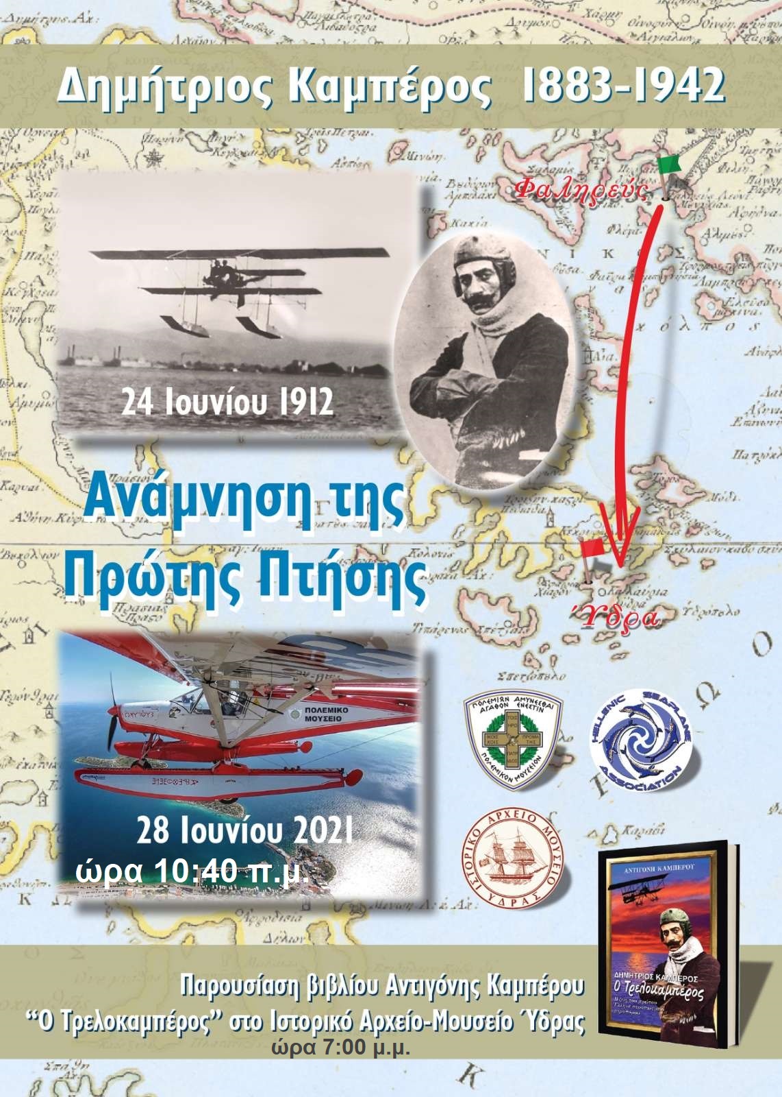 Είναι μια ευκαιρία για όλους, να μάθουμε άγνωστες πτυχές της ζωής και των επιτευγμάτων του Υδραίου αεροπόρου και να παρακολουθήσουμε την προσομοίωση της πτήσης του με υδροπλάνο. Σας περιμένουμε όλες και όλους.