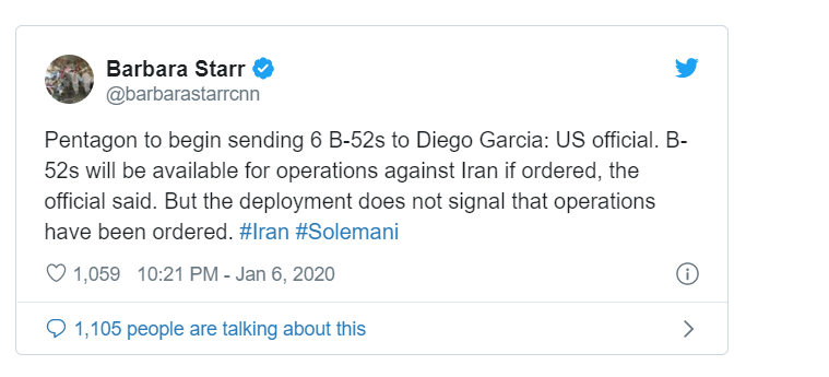 Έξι βομβαρδιστικά Β-52 στέλνει η αμερικανική αεροπορία στη βάση Ντιέγκο Γκαρσία, μια στρατιωτική βάση φτιαγμένη σε μια ατόλη του Ινδικού ωκεανού με τη δυνατότητα να φτάσουν τόσο στη Μέση Ανατολή όσο και στον Ειρηνικό ενώ είναι εκτός βεληνεκούς των ιρανικών πυραύλων.