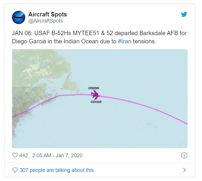 Πρόσφατες δορυφορικές φωτογραφίες που εξασφάλισε το Planet Labs δείχνουν δύο τουλάχιστον Β-52 στον διάδρομο της αεροπορικής βάσης 3,000 μίλια δυτικά του Γκουάμ και 2,300 μίλια από το νοτιότερο τμήμα του Ιράν. Η συγκεκριμένη φωτογραφία έχει χρόνο λήψης 11:09 π.μ. της 8ης Ιανουαρίου και αναφέρεται πως προήλθαν από την ΑΒ Barksdale της Λουιζιάννα.