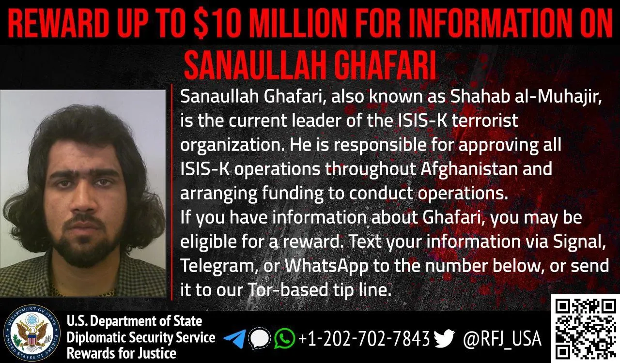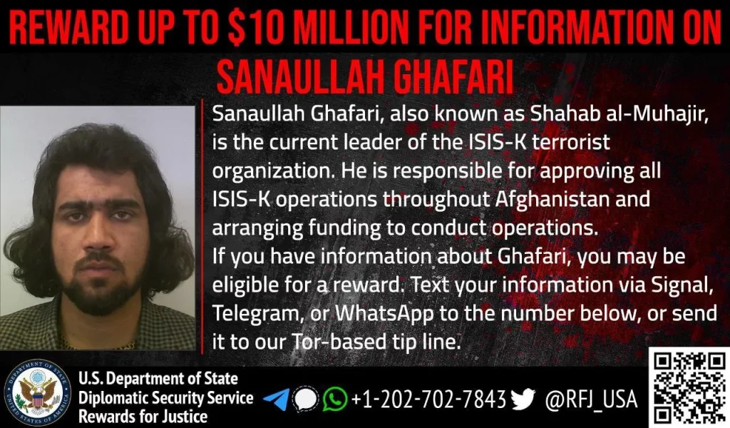 Οι Ηνωμένες Πολιτείες ανακοίνωσαν ότι προσφέρουν αμοιβή έως και 10 εκατομμυρίων δολαρίων, ξεχωριστά, για πληροφορίες που θα οδηγήσουν στην αναγνώριση ή στον εντοπισμό του Σαναουλάχ Γκαφάρι, ηγέτη της τζιχαντιστικής οργάνωσης Ισλαμικό Κράτος του Χορασάν (ISIS-K) — ενός από τα παρακλάδια του ISIS — καθώς και για πληροφορίες που θα οδηγήσουν στη σύλληψη των δραστών της πολύνεκρης επίθεσης στο αεροδρόμιο της Καμπούλ.
