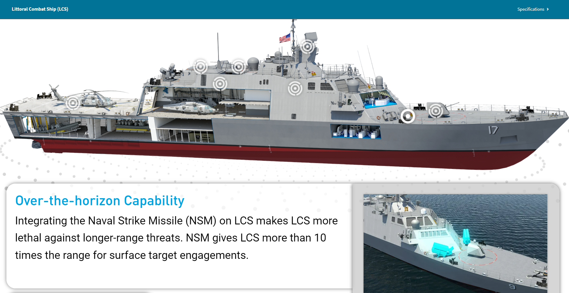Ο NSM εξοπλίζει τα πλοία της κλάσης LCS, έχει επιλεγεί για τις νέες φρεγάτες κλάσης Constellation και αποτελεί βασικό συστατικό του συστήματος NMESIS (Navy Marine Expeditionary Ship Interdiction System) των Αμερικανών Πεζοναυτών. Θυμίζουμε πως στην πρόσφατη πολυεθνική άσκηση RIMPAC 24, εκτελέστηκαν βολές πυραύλων NSM εγκατεστημένων επί του αντιτορπιλικού DDG 62 USS Fitzgerald, πιστοποιώντας την ικανότητα της κλάσης Arleigh Burke να φέρει το βλήμα.