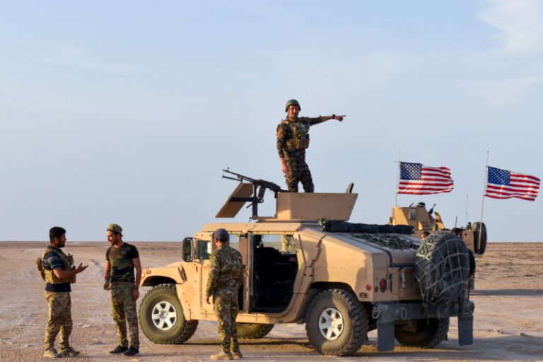 Η φωτογραφία δείχνει αμερικανικές δυνάμεις με μαχητές των SDF, σε κοινή περιπολία στη βορειοανατολική Συρία.
