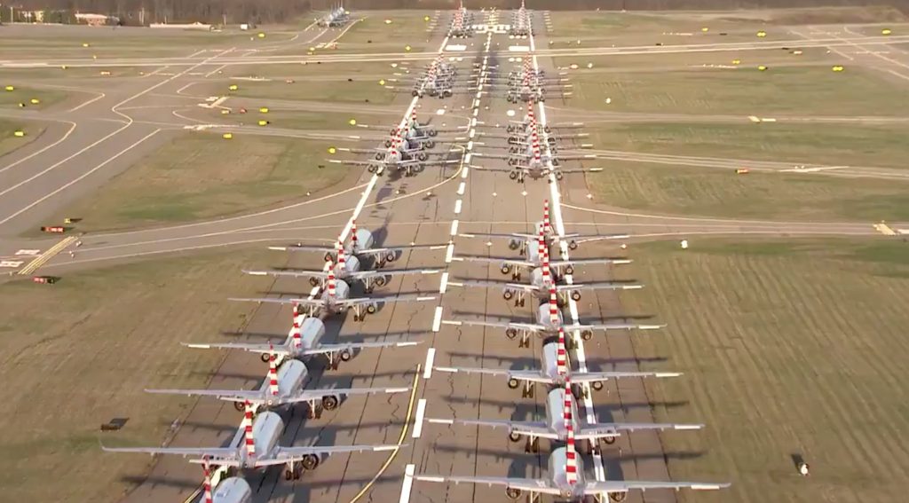 Οι ουρανοί είναι άδειοι, αλλά κάπου πρέπει να σταθμεύσουν τα αεροπλάνα που ήταν στον αέρα… Μένουν κι αυτά, σπίτι… Περιμένοντας το τέλος της πανδημίας, να πετάξουν.