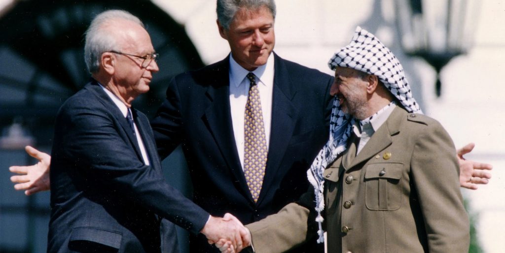 Η εικόνα πέρασε στα βιβλία Ιστορίας: στις 13 Σεπτεμβρίου 1993, υπό το βλέμμα του Αμερικανού προέδρου Μπιλ Κλίντον, ο Παλαιστίνιος ηγέτης Γιασέρ Αραφάτ και ο Ισραηλινός πρωθυπουργός Γιτζάκ Ράμπιν σφίγγουν τα χέρια στεκόμενοι στο γκαζόν του Λευκού Οίκου.
