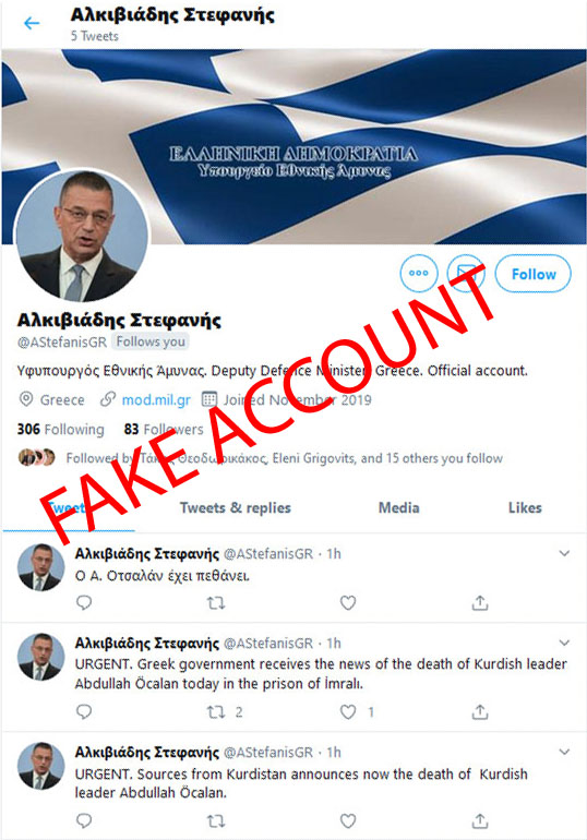 Όπως έγινε γνωστό από το υπουργείο Εθνικής Άμυνας, ο λογαριασμός @AStefanisGR που εμφανίστηκε στο twitter και φέρεται να ανήκει στον υφυπουργό Εθνικής Άμυνας Αλκιβιάδη Στεφανή, αποτελεί ψεύτικο προφίλ, επομένως και οι ειδήσεις που αναρτώνται σε αυτόν είναι παραπλανητικές και ανυπόστατες (fake news).