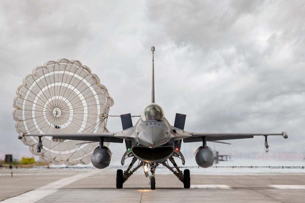 Σε όλα τα μοντέλα τουρκικών F-16 υπάρχουν αλεξίπτωτα ανάσχεσης εκτός από τα Block 50. Εδώ ένα F-16C Block 40M, με αναπτυγμένο αλεξίπτωτο και αεροφρένα.