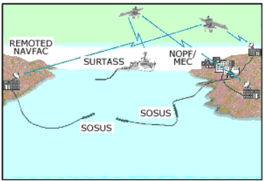SOSUS consists of bottom mounted hydrophone arrays connected by undersea communication cables to facilities on shore, such as a remote Naval Facility (NAVFAC) and a Naval Ocean Processing Facility and Meteorology Center (NOPF/MEC). Photo Courtesy of NOAA Ocean Explorer.