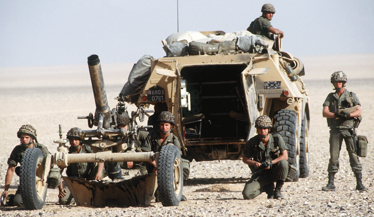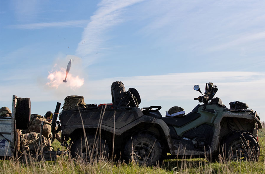 Σε πιο δύσβατα εδάφη οι Βρετανοί Πεζοναύτες χρησιμοποιούν quad 6×6 για να ρυμουλκούν τους όλμους των 81 mm και τα πυρομαχικά τους.