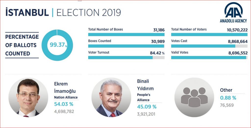 Η διαδικασία επανάληψης των εκλογών για τον δήμο της Κωνσταντινούπολης μπορεί να αμφισβητήθηκε από δεκάδες διεθνείς οργανισμούς, χάρισε όμως στους Τούρκους πολίτες μια – σπάνια για τη χώρα – δημοκρατική διαδικασία. Στην εκλογική αναμέτρηση της 31ης Μαρτίου, ο υποψήφιος του Ρεπουμπλικανικού Λαϊκού Κόμματος (CHP), Εκρέμ Ιμάμογλου, επικράτησε με μικρή διαφορά του εκλεκτού του Τούρκου προέδρου, Μπιναλί Γιλντιρίμ, σε μία σπάνια εκλογική ήττα για τον Ερντογάν.