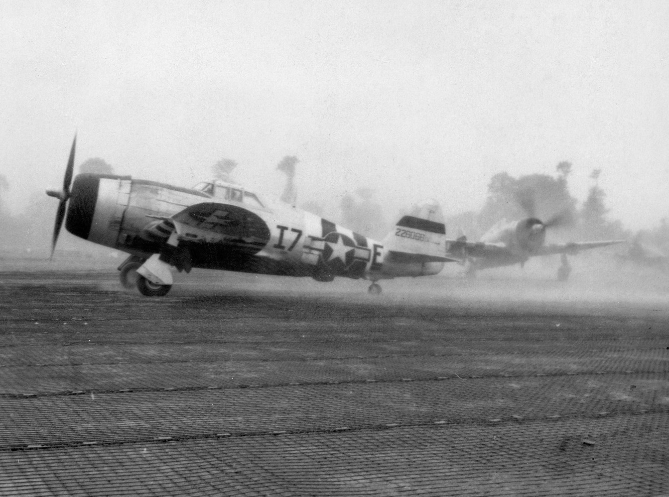 «Μία Μοίρα δεκαέξι P-47D απογειώθηκε για μια αποστολή καθέτου βομβαρδισμού στις 13:56 της 8ης Ιουνίου 1944. Στο Cerisy-la-Forêt μια φάλαγγα 12 και πλέον αρμάτων μάχης δέχθηκε επίθεση στις 14:40 και πολλά κάηκαν. Περίπου 30 βόμβες ερρίφθησαν στα άρματα που επίσης πολυβολήθηκαν. Ένα απευθείας πλήγμα σημειώθηκε επί ημιερπυστριοφόρου στην διασταύρωση Ν. του Cerisy La Ford (επί λέξη) καταστρέφοντάς το ολοσχερώς, 18 βόμβες ερρίφθησαν σε μια περιοχή κοντά στο Foret des Biards και μετά η περιοχή επολυβολήθη».