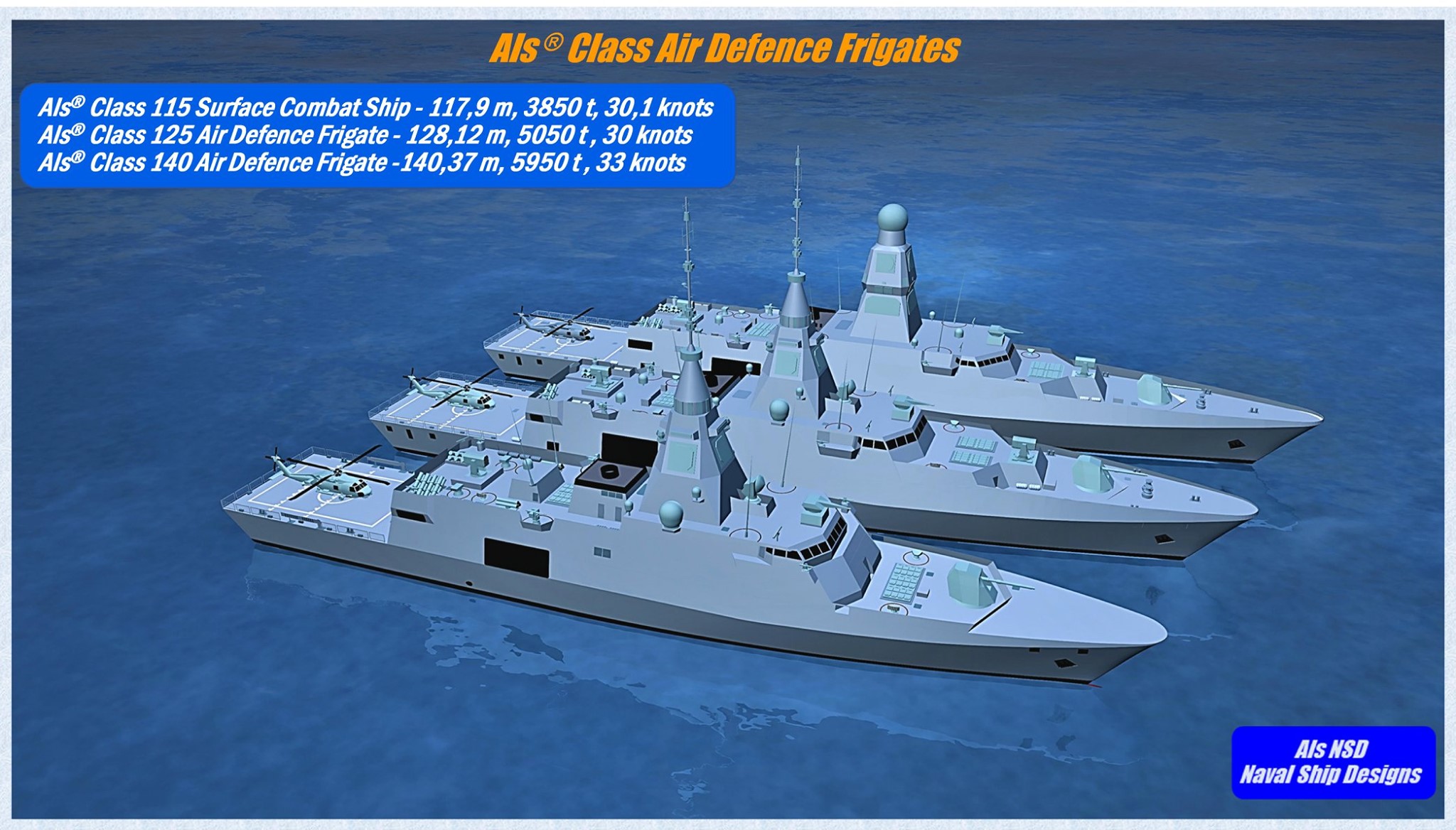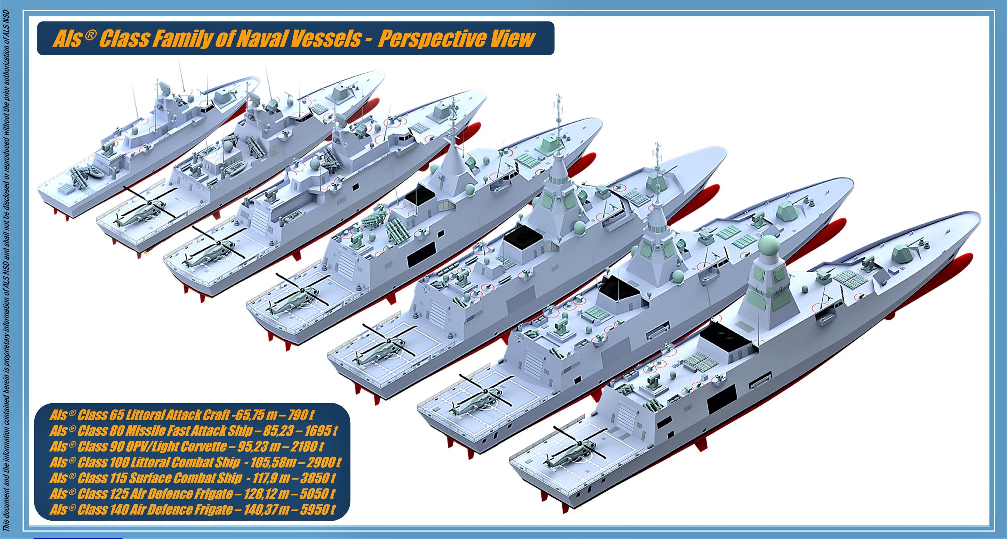 Η οικογένεια αυτή των σκαφών που σχεδίασε η ALS NDS περιλαμβάνει πολεμικά σκάφη διαφόρων τύπων και μεγεθών, από απλό περιπολικό των 65 μέτρων μέχρι και μεγάλη φρεγάτα περιοχής των 140 μέτρων.