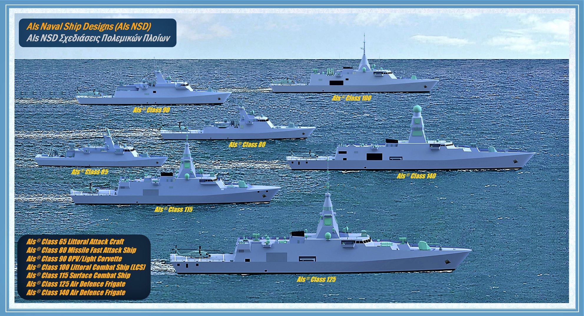 Η Als NSD – Als Naval Ship Designs σε συνεργασία με την Ελληνική εταιρεία Veritas International με ίδιους πόρους, και με όραμα την αύξηση της αποτρεπτικής ικανότητος των Ενόπλων Δυνάμεων και τη μείωση της εξάρτησης της χώρας μας από το εξωτερικό, έχει ξεκινήσει εδώ και περισσότερα από 10 χρόνια μια εθνική προσπάθεια για τον σχεδιασμό μιας “οικογένειας” πολεμικών πλοίων για την κάλυψη των αναγκών του Π.Ν. και όχι μόνο.
