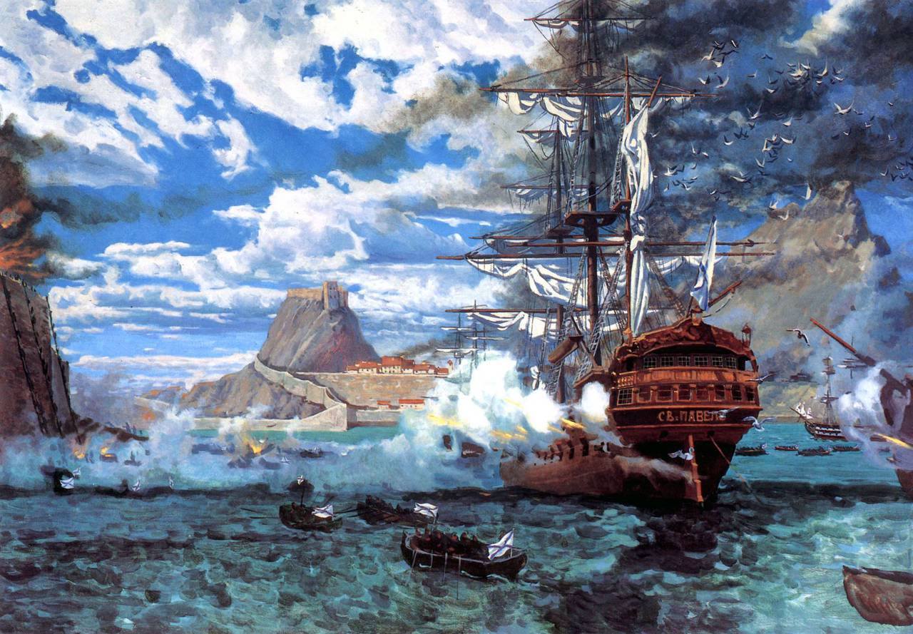 Το 1798, ο Ρώσος ναύαρχος Φιοντώρ Ουσακώφ στάλθηκε με δυνάμεις στην περιοχή για να ενισχύσει τους Τούρκους να καταλάβουν τα νησιά. Η κίνηση ήταν μια από τις συμμαχίες της τσαρίνας Αικατερίνης της Μεγάλης εναντίον της επαναστατημένης Γαλλίας και η ρωσική μοίρα θα ενίσχυε τις προσπάθειες του στρατηγού Αλεξάντρ Σουβόρωφ, που με τον στρατό του περνούσε τις αυστριακές Άλπεις για να συγκρουστεί με τον εχθρό στην Ιταλία. Οι γαλλικές φρουρές των Επτανήσων, απομονωμένες ως ήταν, δεν αντιστάθηκαν ιδιαίτερα.