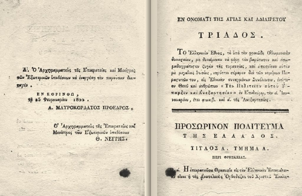 Τίθεται σε ισχύ το πρώτο Σύνταγμα της Ελλάδας, το «Προσωρινόν Πολίτευμα», όπως ονομάστηκε, που συγκέντρωνε σε 110 παραγράφους τις πιο δημοκρατικές και φιλελεύθερες θέσεις της εποχής του και αποτέλεσε οδηγό για την πολιτειακή οργάνωση των επαναστατημένων Ελλήνων.