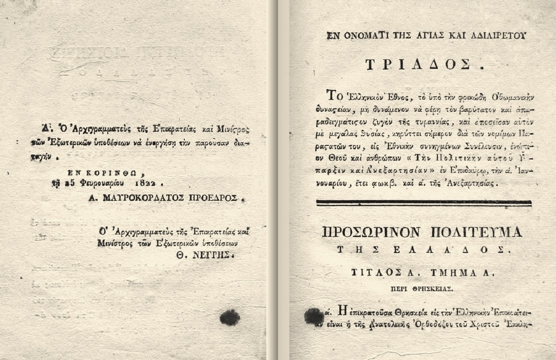 Το κείμενο της Α΄Εθνοσυνέλευσης της Επιδαύρου (που διεξήχθη μεταξύ 20 Δεκεμβρίου 1821 – και 15 Ιανουαρίου 1822) έφερε επιρροές από τις διακηρύξεις της γαλλικής Επανάστασης, των νεοελλήνων διαφωτιστών και της Αμερικανικής διακήρυξης της Ανεξαρτησίας και αντικατέστησε όλες τις προηγούμενες επαναστατικές αρχές. Το συνταγματικό κείμενο όριζε σαφή διάκριση των εξουσιών, με την ίδρυση του Βουλευτικού, του Εκτελεστικού (τα δύο αυτά μαζί αποτελούσαν την «Διοίκησιν») και του Δικαστικού (με ίδρυση των «Κριτηρίων», δηλαδή των δικαστηρίων), ενώ καθόριζε και την ίδρυση κοινώς αποδεκτού εθνικού συμβόλου, της ελληνικής σημαίας.