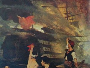 Σε μια από τις πιο εμβληματικές στιγμές και τολμηρές ενέργειες της Ελληνικής Επανάστασης, ο Κανάρης πυρπολεί με μια νυχτερινή έφοδο τη ναυαρχίδα του τουρκικού στόλου στη Χίο.