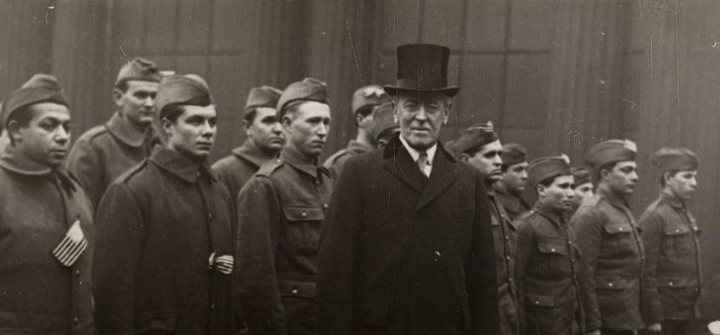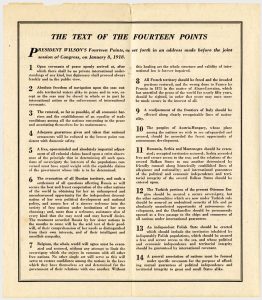 Την αμήχανη ηρεμία που κυριάρχησε προς στιγμή στα πολιτικά πράγματα ανέλαβε να σπάσει ο Αμερικανός πρόεδρος Γουίλσον με την ομιλία του στο Κογκρέσο, όπου εξέθεσε τις απόψεις του για ένα σχέδιο ειρήνης του μεταπολεμικού κόσμου. Ιδεολόγος και πραγματιστής σε μια σπάνια ισορροπία, ο Γουίλσον είπε αρχικά πως εντόπιζε τις αιτίες της παγκόσμιας σύρραξης σε μια σειρά λαθών που είχαν να κάνουν με την έλλειψη εμπιστοσύνης και σεβασμού, στη χρήση μυστικής διπλωματίας, στον ανταγωνισμό, που εκφραζόταν και με πυρετώδεις κούρσες εξοπλισμών και στις προστριβές στα θέματα των αποικιών.