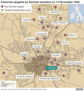 Η παλιά μεσαιωνική πόλη αποτελούσε σημαντικό βιομηχανικό και παραγωγικό κέντρο στις αρχές του 20ού αιώνα, με πολλές μονάδες επεξεργασίας μετάλλου και ξύλου, εταιρίες κατασκευής κινητήρων, αυτοκινήτων, ποδηλάτων και από την αρχή του πολέμου, με εργοστάσια παραγωγής πυρομαχικών. Όπως ήταν αναμενόμενο, με την έναρξη των γερμανικών αεροπορικών βομβαρδισμών στη μάχη της Βρετανίας, έγινε στόχος επιθέσεων τον Αύγουστο και τον Οκτώβριο του 1940. Αυτοί επηρέασαν κάπως την πολεμική παραγωγή αλλά παρά το κλείσιμο μερικών εργοστασίων και την απώλεια 150 περίπου ζωών, αυτή συνεχίστηκε.