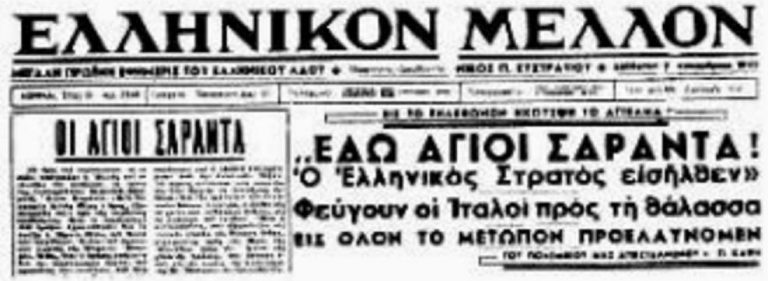 Οι Ελληνικές δυνάμεις μπαίνουν στο λιμάνι των Αγίων Σαράντα, στη Βόρειο Ήπειρο εκδιώκοντας τις ιταλικές κατά τις επιθετικές επιχειρήσεις που είχε αναλάβει από τις 14 Νοεμβρίου. Η απελευθέρωση της ελληνικής πόλης έρχεται σε ένα κρεσέντο επιτυχιών στο μέτωπο που προκαλεί παροξυσμό ενθουσιασμού στη χώρα.