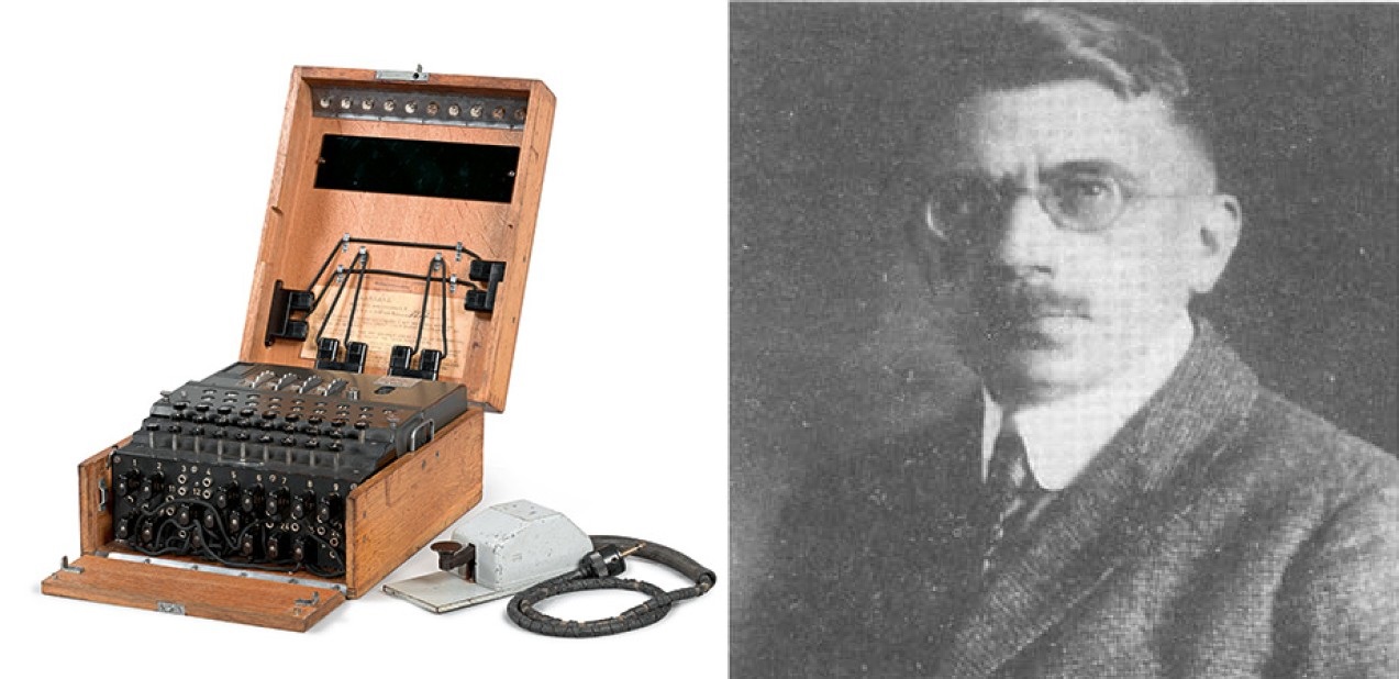 Η συσκευή με το ελληνικό όνομα, ολοκληρώθηκε από τον ηλεκτρολόγο μηχανικό Arthur Scherbius κατά το τέλος του Α΄ Παγκοσμίου Πολέμου και υιοθετήθηκε από τις γερμανικές ένοπλες δυνάμεις το 1925, εξοπλίζοντας κάθε αεροδρόμιο, πολεμικό πλοίο και μονάδα στρατού από μέγεθος τάγματος και πάνω.