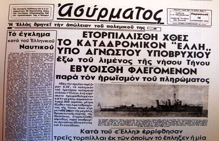 Βυθίζεται σε ναυτικό ατύχημα έξω από το ναύσταθμο του Τάραντα το ιταλικό υποβρύχιο “Delfino”. Το οποίο ήταν γνωστό από την τορπιλική επίθεση και βύθιση του ελληνικού ελαφρού καταδρομικού (ευδρόμου) “Έλλη” το Δεκαπενταύγουστο του 1940 στην Τήνο.