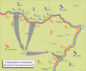 Με την απελπισία του ηττημένου, οι Γερμανοί εξαπολύουν λίγο πριν την εκπνοή του 1944 μια νέα μηχανοκίνητη επίθεση στο Δυτικό Μέτωπο. Η επιχείρηση “Βόρειος Άνεμος” (Unternehmen Nordwind) έγινε ενώ ήδη εξελισσόταν η γερμανική προσπάθεια στις Αρδέννες, αλλά τώρα με προσανατολισμό πρός το Νότο, στις περιοχές της Αλσατίας, της Λωραίνης και της Ρηνανίας-Παλατινάτου.