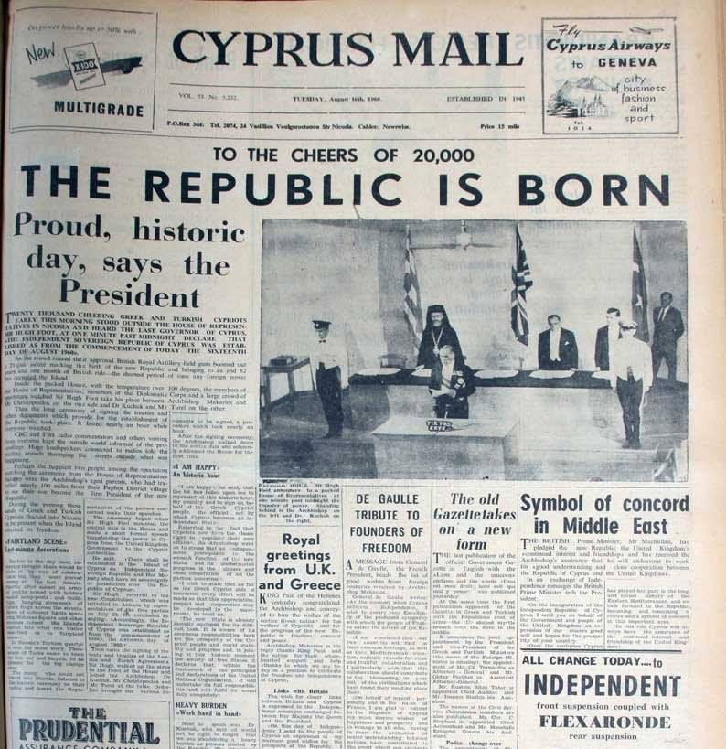 Η Κυπριακή Δημοκρατία ανακηρύσσεται επίσημα ως ανεξάρτητο κράτος βάσει των Συμφωνιών Ζυρίχης-Λονδίνου του 1959, αποτινάσσοντας το αποικιακό της καθεστώς από τη Βρετανία. Οι συμφωνίες Ζυρίχης-Λονδίνου ήταν το αποτέλεσμα μια σειράς μεγάλων και επίπονων προσπαθειών να επιλυθεί το Κυπριακό ζήτημα. Μετά από πέντε χρόνια επιτυχημένου αντάρτικου από την Ε.Ο.Κ.Α. (Εθνική Οργάνωσις Κυπρίων Αγωνιστών), οι Βρετανικές δυνάμεις παραδέχθηκαν πως το πνεύμα της αντίστασης δεν λύγιζε παρά τις βάναυσες προσπάθειές τους. Με την επιμονή των Βρετανών, η Τουρκία προσήλθε και αυτή στο τραπέζι των συνομιλιών, μαζί με την Ελλάδα, για λόγους ισορροπίας.