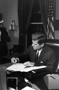 Ο πρόεδρος των ΗΠΑ, Τ. Φ. Κέννεντυ μιλά από τηλεόρασης για την ανακάλυψη σοβιετικών βαλλιστικών πυραύλων στην Κούβα και αποκαλύπτει την εμπλοκή της Μόσχας. Στην ανακοίνωσή του αναφέρει την έναρξη ναυτικού αποκλεισμού του νησιού και τονίζει ότι: «πολιτική αυτού του έθνους θα γίνει να θεωρεί κάθε εκτόξευση πυρηνικού πυραύλου από την Κούβα εναντίον οποιουδήποτε έθνους του Δυτικού Ημισφαιρίου, ως επίθεση της ΕΣΣΔ κατά των ΗΠΑ, που θα αντιμετωπιστεί με πλήρη αντίποινα εναντίον της».