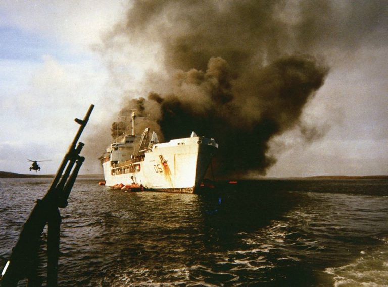 Τα βρετανικά οπλιταγωγά RMS Sir Galahad και Sir Tristram και η φρεγάτα HMS Plymouth βομβαρδίζονται από δύο κύματα αργεντινών A-4 Skyhawk στον πόλεμο των Φώκλαντ.