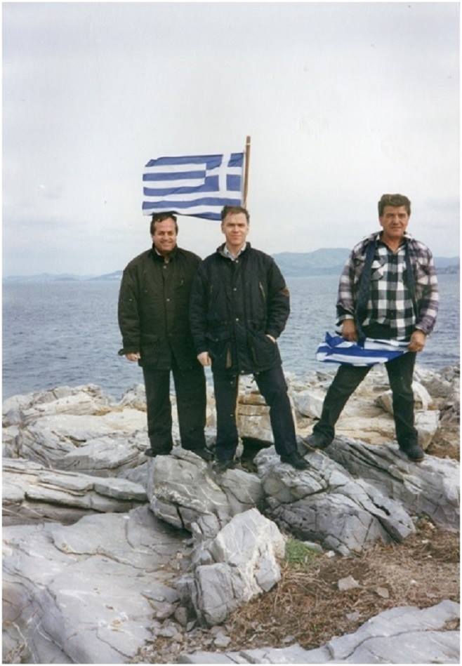 Θορυβημένος από τις δηλώσεις του τουρκικού ΥΠΕΞ μετά την χριστουγεννιάτικη προσάραξη τουρκικού πλοίου στις βραχονησίδες Ίμια, ο δήμαρχος Καλύμνου, Δημήτρης Διακομιχάλης, συνοδευόμενος από τον αστυνομικό διευθυντή, δύο κατοίκους κι έναν παπά υψώνουν την ελληνική σημαία στη μικρή Ίμια.