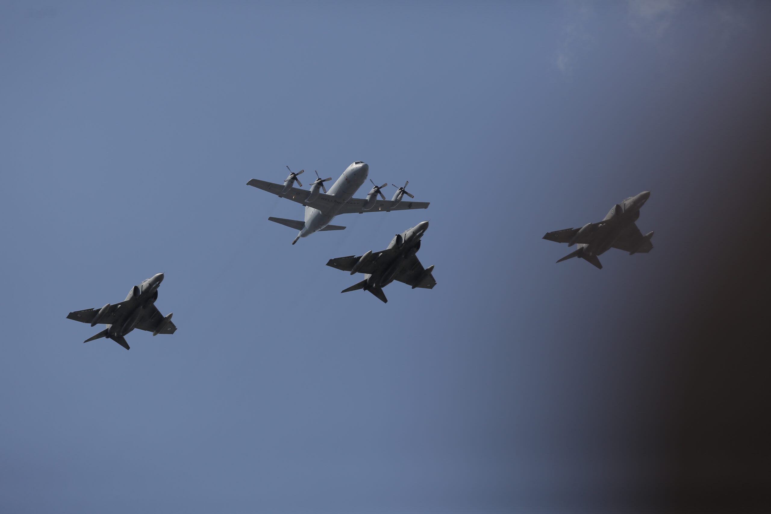 Σε τετράδες πέταξαν μαχητικά αεροσκάφη της Πολεμικής Αεροπορίας F-16, M-2000/5 και F-4, μαζί με RAFALE της γαλλικής Πολεμικής Αεροπορίας, F-16 της Πολεμικής Αεροπορίας των ΗΠΑ και 2 αεροσκάφη εναέριου ανεφοδιασμού αεροσκάφη (VOYAGER της Πολεμικής Αεροπορίας του Ηνωμένου Βασιλείου και KC-135 της Πολεμικής Αεροπορίας των ΗΠΑ).