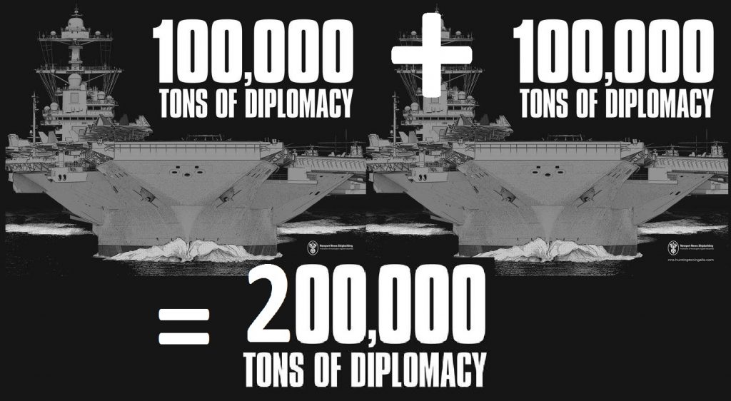 Μέχρι τώρα ξέραμε ότι ένα αμερικανικό αεροπλανοφόρο αντιστοιχούσε σε «100.000 τόνους διπλωματίας», βάσει του εκτοπίσματός του προφανώς. Τώρα λοιπόν έχουμε να κάνουμε με 200.000 τόνους διπλωματίας, αφού μιλάμε πλέον για δυο αεροπλανοφόρα ταυτόχρονα.