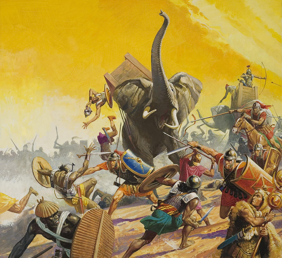 H μάχη στη Ζάμα, κοντά στην Καρχηδόνα ξεκίνησε με την ορμητική επέλαση των ελεφάντων. Έτοιμος για το ενδεχόμενο, ο Σκιπίων διέταξε το ιππικό του να φυσήξει κέρατα παράγοντας τόσο θόρυβο, που οι ελέφαντες τρόμαξαν και μερικοί πισωγύρισαν σκορπίζοντας τις πρώτες καρχηδονιακές γραμμές. Όσοι κατόρθωσαν να ηρεμήσουν και να κινηθούν κατά των Ρωμαίων, αντιμετωπίστηκαν με τις κοόρτεις να συμπτύσσονται σχηματίζοντας διαδρόμους, μέσα από τους οποίους τα παχύδερμα πέρασαν στα μετόπισθεν, όπου ακοντιστές τα χτυπούσαν στα μαλακά μέρη.