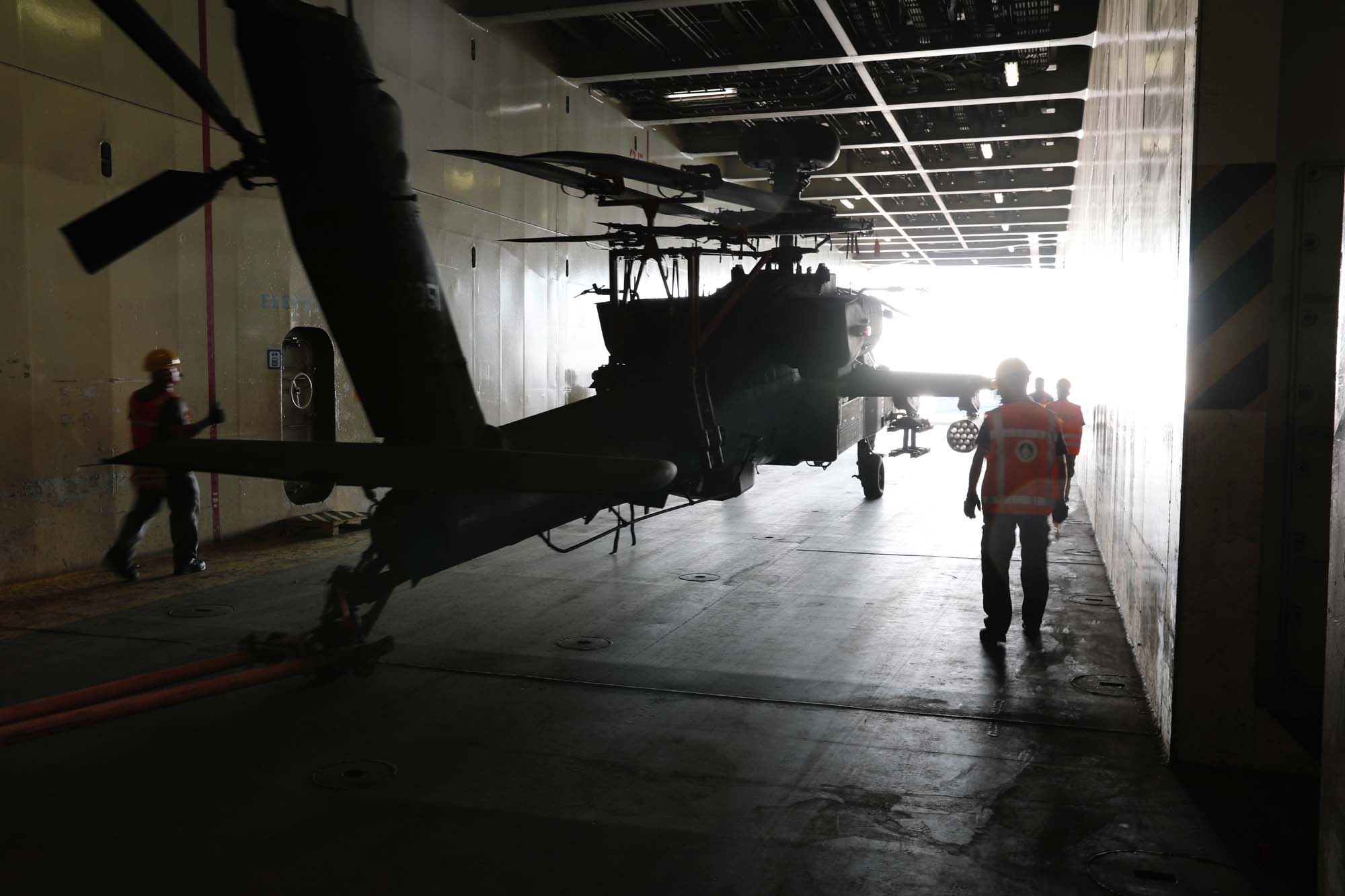 Ελικόπτερα AH-64 Apache και UH-60 Blackhawk μαζί με μέσα και υλικά της 3ης CAB (Combat Aviation Brigade), υπομονάδα της 3ης Μεραρχίας Πεζικού του Αμερικανικού Στρατού εκφορτώνονται από το ARC Endurance στο Βόλο με τελικό προορισμό το Στεφανοβίκιο, χθες. Τα αμερικανικά ελικόπτερα φτάνουν στην Ευρώπη στο πλαίσιο της Επιχείρησης Atlantic Resolve για διμερή συνεκπαίδευση με τις Ελληνικές Ένοπλες Δυνάμεις επαναλαμβάνοντας την διαδικασία που είχε υλοποιήσει πριν από ένα χρόνο η 2η CAB. Αναμένεται να παραμένουν σε ελληνικό έδαφος για πέντε περίπου μήνες.