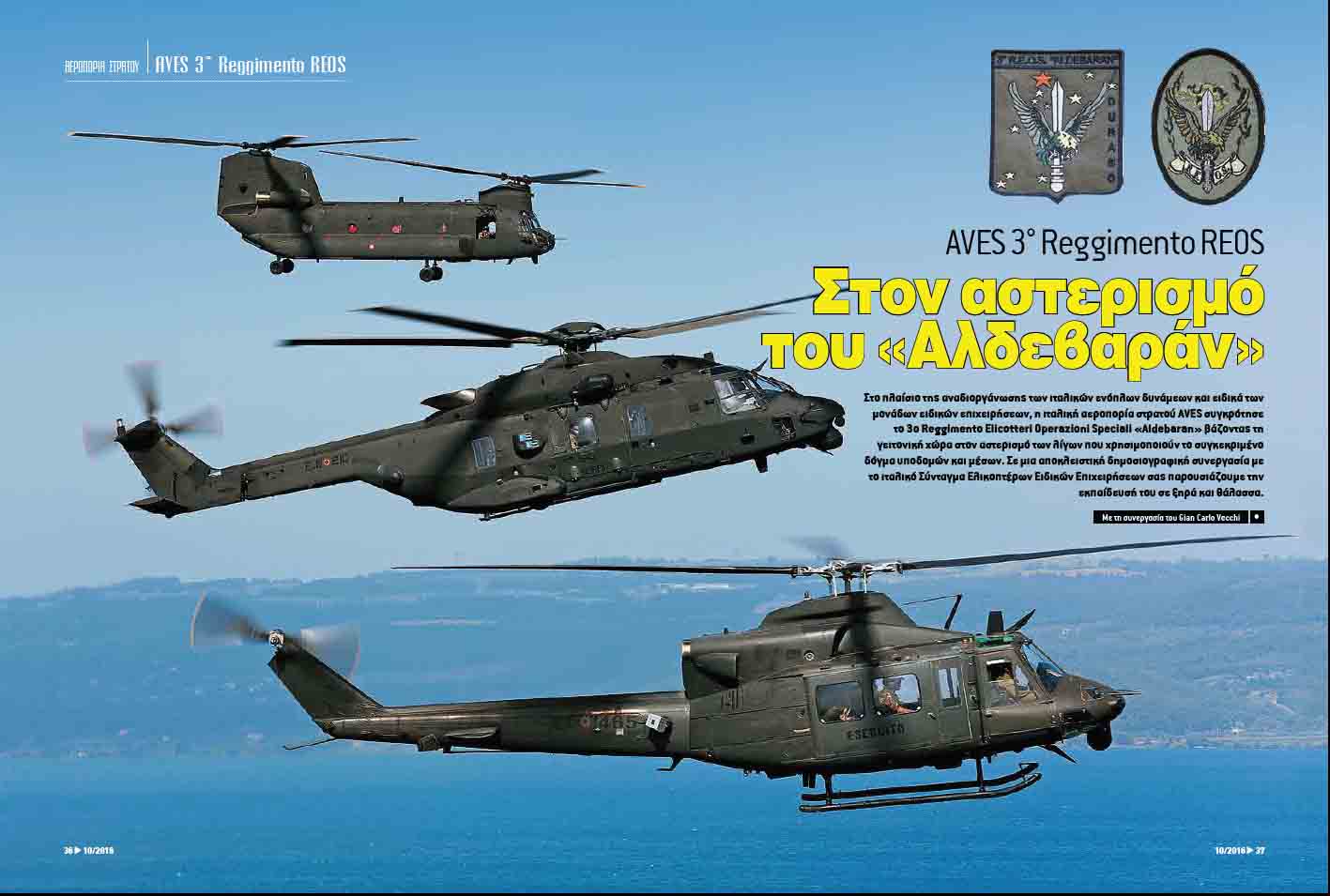Στο πλαίσιο της αναδιοργάνωσης των ιταλικών ενόπλων δυνάμεων και ειδικά των μονάδων ειδικών επιχειρήσεων, η ιταλική αεροπορία στρατού AVES συγκρότησε το 3ο Reggimento Elicotteri Operazioni Speciali «Aldebaran» βάζοντας τη γειτονική χώρα στον αστερισμό των λίγων που χρησιμοποιούν το συγκεκριμένο δόγμα υποδομών και μέσων. Σε μια αποκλειστική δημοσιογραφική συνεργασία με το ιταλικό Σύνταγμα Ελικοπτέρων Ειδικών Επιχειρήσεων σας παρουσιάζουμε την εκπαίδευσή του σε ξηρά και θάλασσα.