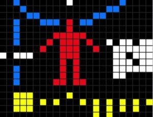 - Γραφική απεικόνιση ανθρώπου, στις διαστάσεις (ύψος) ενός μέσου ανθρώπου, και ο ανθρώπινος πληθυσμός της Γης (ερυθρά, γαλανά/λευκά, και λευκά τετράγωνα)