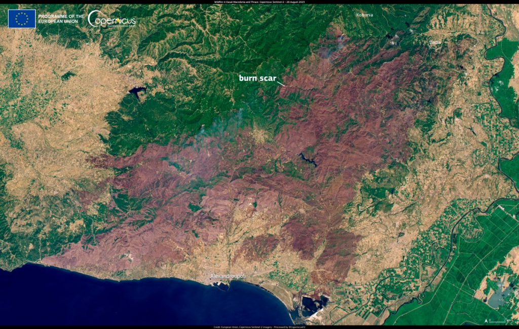Σε φωτογραφία από την υπηρεσία Copernicus της Ευρωπαϊκής Επιτροπής (λήψη από τους δορυφόρους Sentinel-2), φαίνεται η έκταση της καταστροφής στον Έβρο, που φθάνει πλέον τα 808.000 στρέμματα κι αυτό έως τις 28 Αυγούστου! Η μονάδα ΜΕΤΕΟ του Εθνικού Αστεροσκοπείου Αθηνών επεξεργάστηκε την εικόνα για καλύτερη οπτικοποίηση της. Η πυρκαγιά είναι η μεγαλύτερη δασική στην Ελλάδα εδώ και 21 χρόνια.