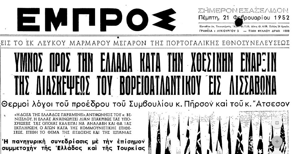 Η Ελληνική Βουλή επικύρωσε τη συμφωνία ένταξης της χώρας μας στο ΝΑΤΟ στις 18 Φεβρουαρίου 1952, επί κυβερνήσεως Νικόλαου Πλαστήρα.