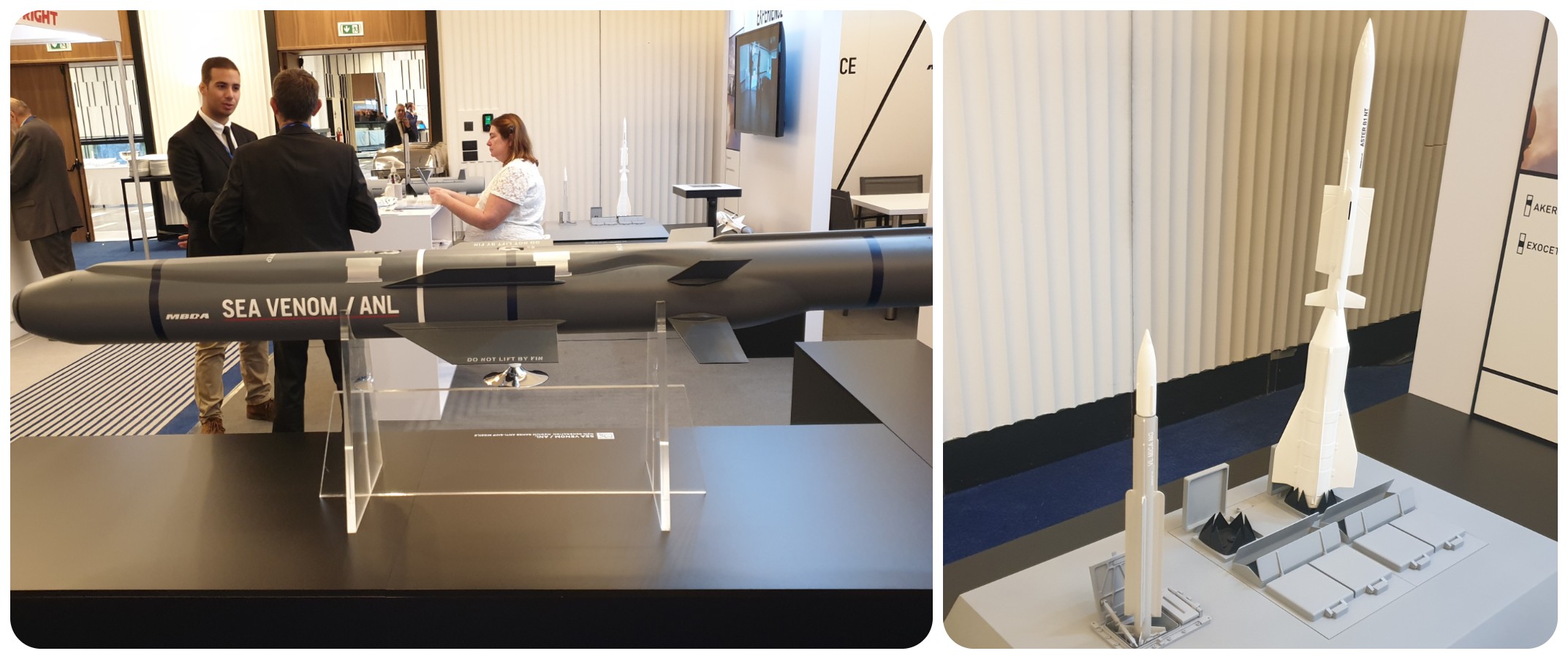 Στο περίπτερο της MBDA France είδαμε τον αεροεκτοξευόμενο πύραυλο επιφανείας μικρής εμβέλειας (20 χλμ,) SEA VENOM/ANL, ο οποίος θα αντικαταστήσει σε υπηρεσία τους Sea Squa και AS15TT, τον πύραυλο AKERON MP, ο οποίος προορίζεται για τοποθέτηση σε μικρά σκάφη και έχει αρκετά προηγμένα χαρακτηριστικά εκτόξευσης και εγκλωβισμού στόχων και τέλος τους πυραύλους ASTER 30 B1NT και VL-MICA NG.