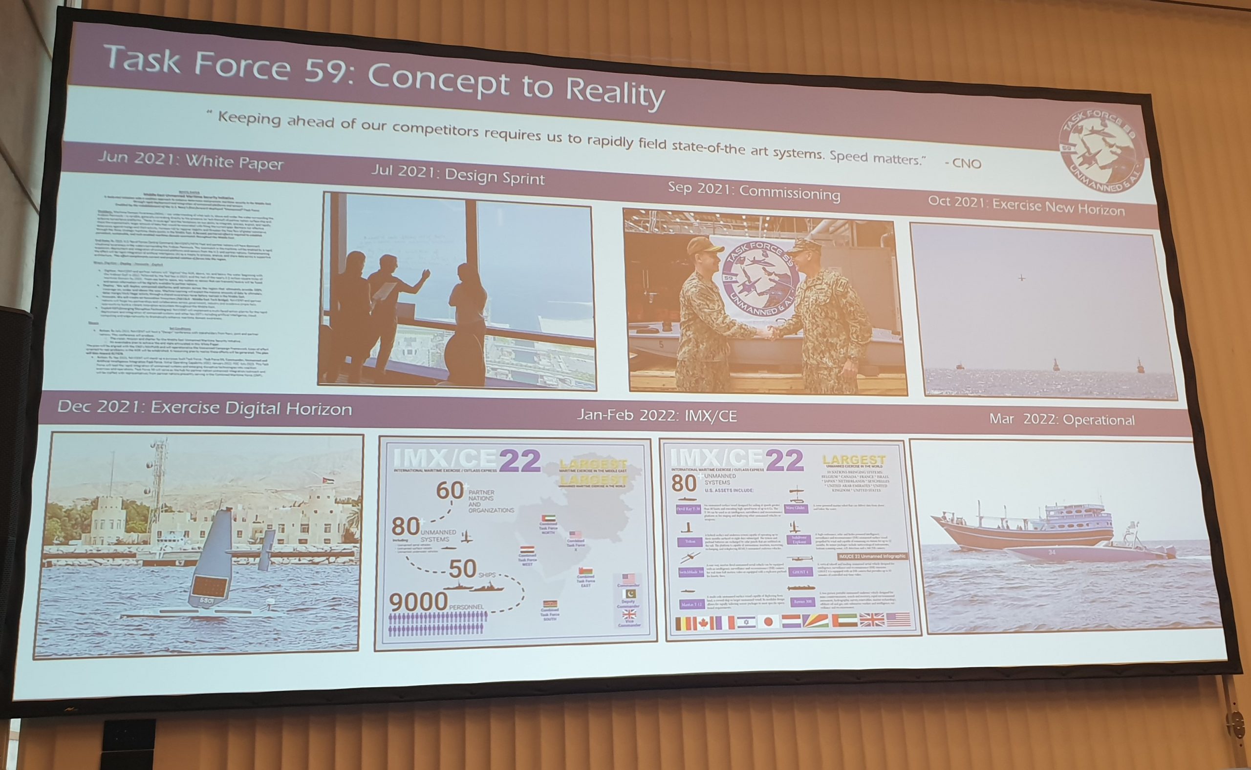 Σίγουρα η εντυπωσιακή παρουσίαση των Αμερικανών της Task Force 59 και τις δύο ημέρες. Η γνωστή και ως Unmanned Task Force, που πολύ πρόσφατα ξεκίνησε τη δράση της, προσφέρει μέσω μη επανδρωμένων συστημάτων εμπειρία στις ναυτικές επιχειρήσεις του αύριο. Και έχει να επιδείξει σημαντικά επιτεύγματα στον Αραβικό Κόλπο, απ’ όπου επιχειρεί. Σύμφωνα με τις πληροφορίες που μας δόθηκαν η ψηφιοποίηση της επιτήρησης των σημαντικών θαλασσίων οδών είναι ένα βήμα πιο κοντά στην πραγματοποίησή της.