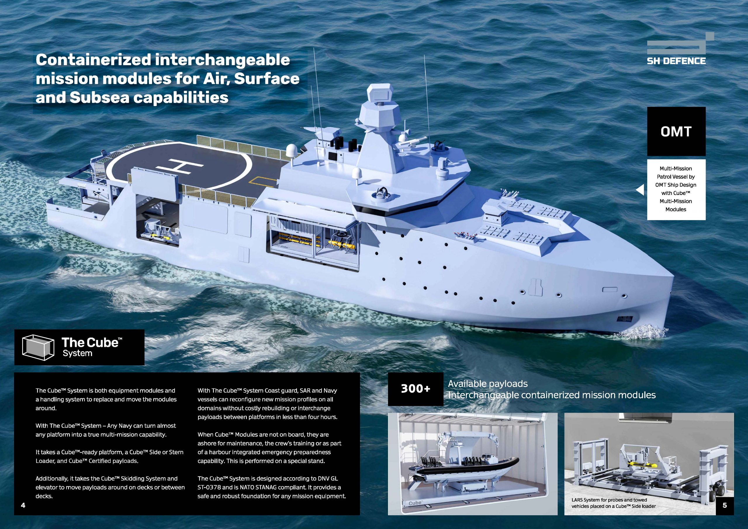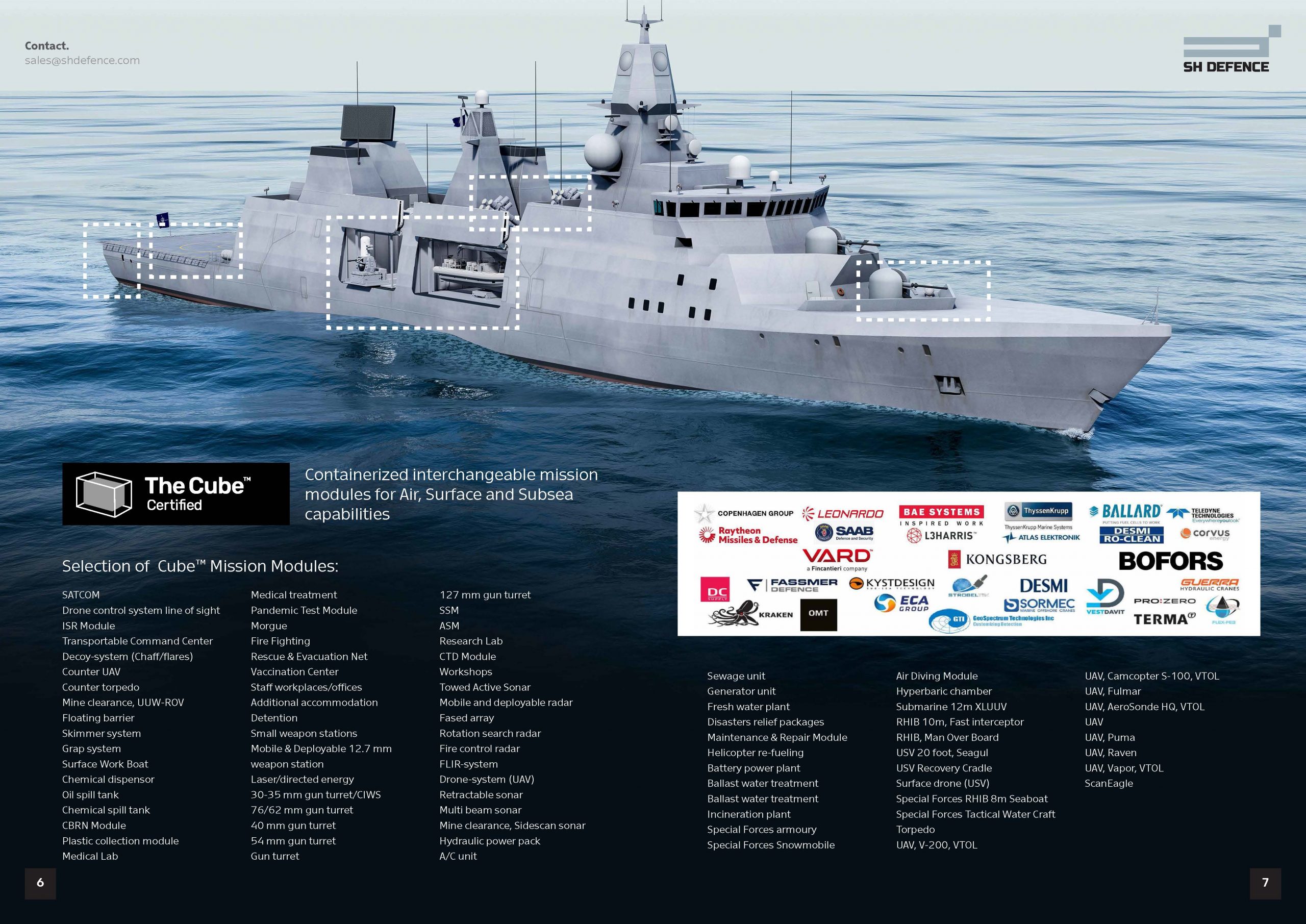 To “Cube” αποτελείται τόσο από τα τυποποιημένα σε μορφή container, modules αποστολών, όσο και από το εγκατεστημένο εντός και εκτός του πλοίου, σύστημα διαχείρισης. Με πάνω από 300 διαθέσιμα modules αποστολών, μπορεί να ικανοποιήσει κάθε επιχειρησιακή ανάγκη, καθώς για την διαρρύθμισή τους έχουν συνεργαστεί εταιρείες όπως η Elbit, η Raytheon, η Rheinmetall, η Thales, η Thyssenkrupp κ.α. Το σύστημα αξίζει ξεχωριστή παρουσίαση και θα επανέρθουμε γι’ αυτό αναφέροντας ότι πιθανότατα θα αποτελέσει συστατικό στοιχείο της μελλοντικής ευρωκορβέτας (EPC), την οποία αναμένεται να προμηθευτεί το ΠΝ.