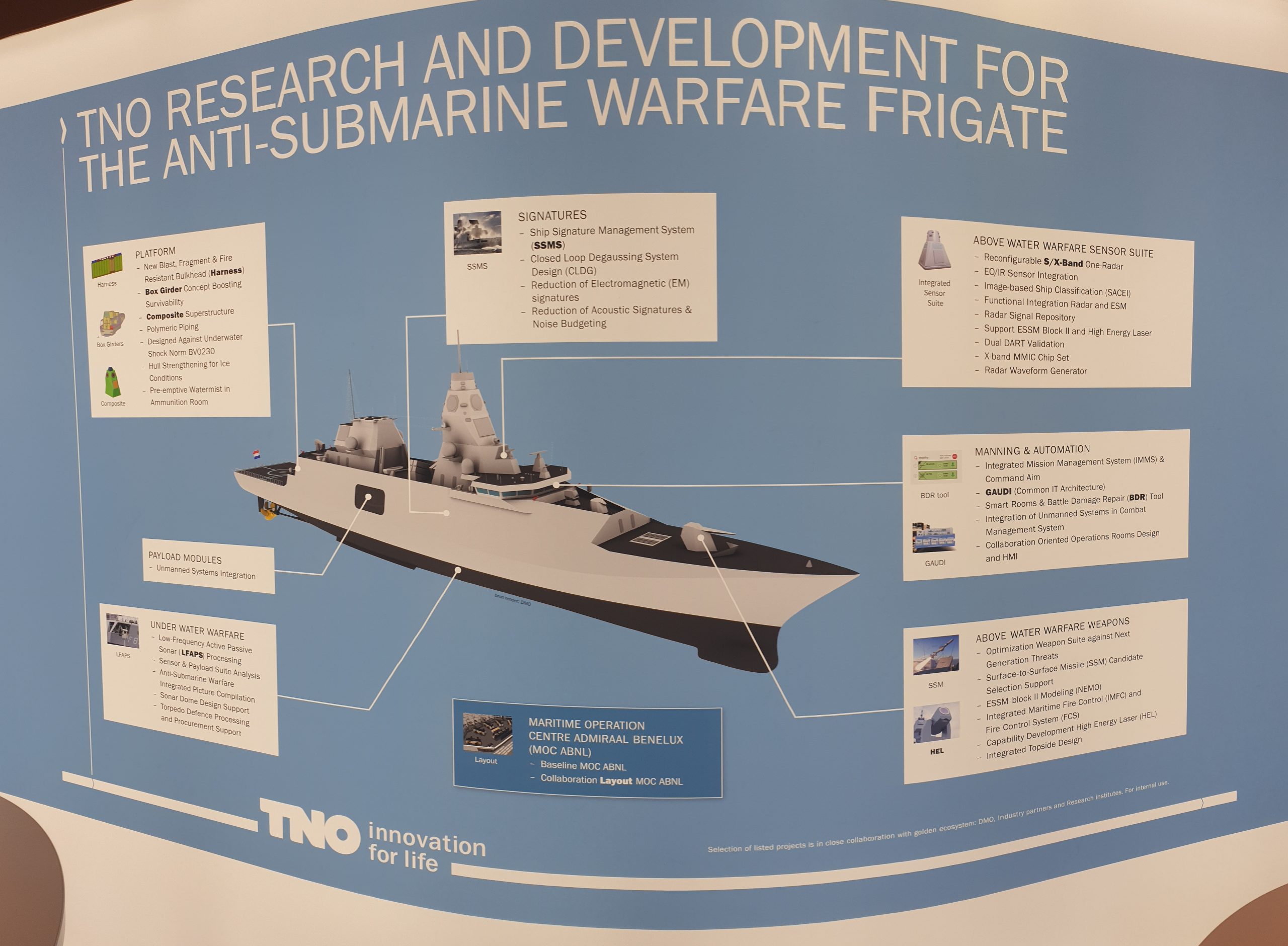Στο ολλανδικό περίπτερο δεσπόζουσα θέση είχε η απεικόνιση για τη νέα ανθυποβρυχιακή φρεγάτα που θα αναπτυχθεί από κοινού με το Βέλγιο, ενώ πιθανολογείται ότι εξαρχής το πλοίο θα είναι εξοπλισμένο με laser υψηλής ισχύος.