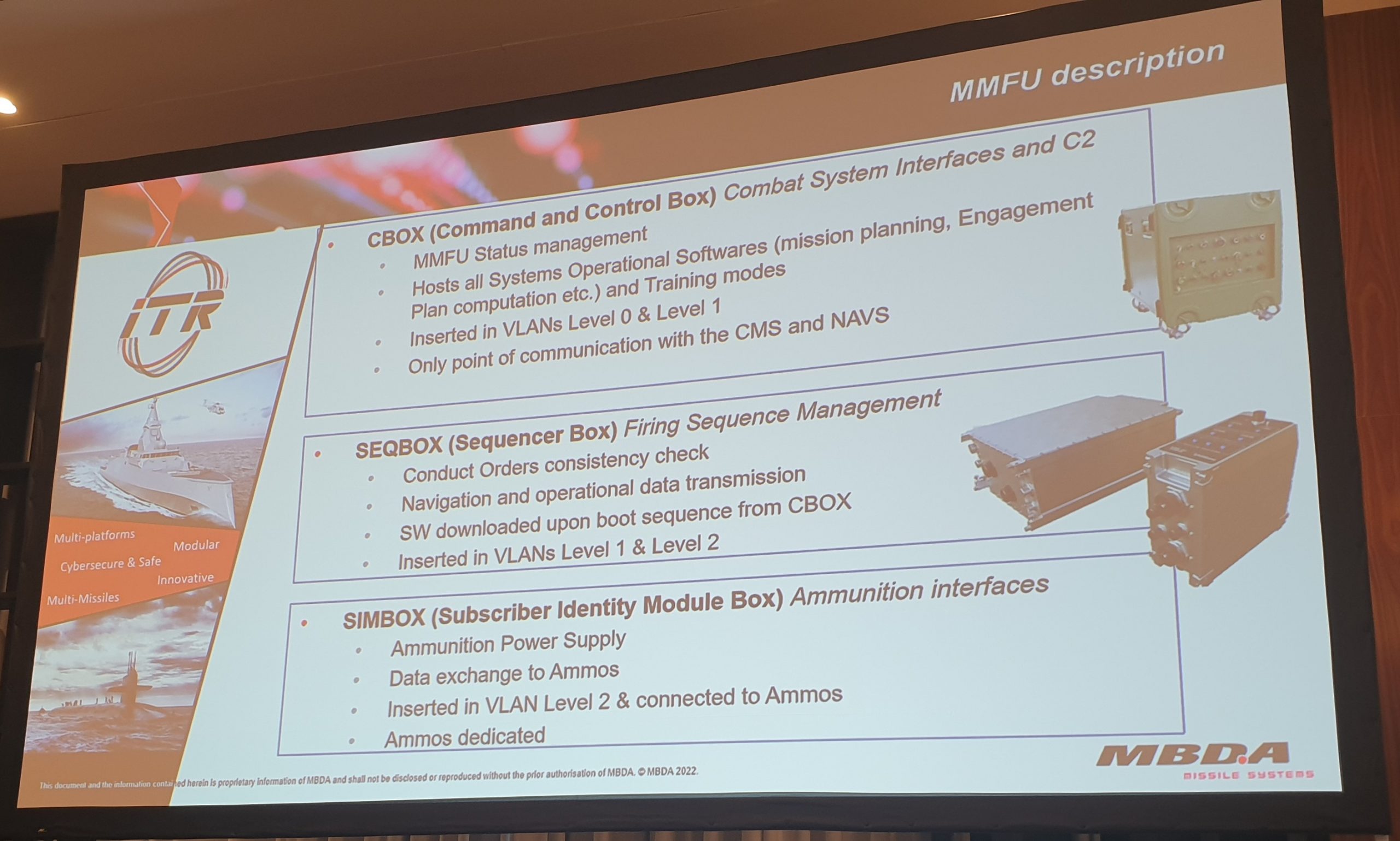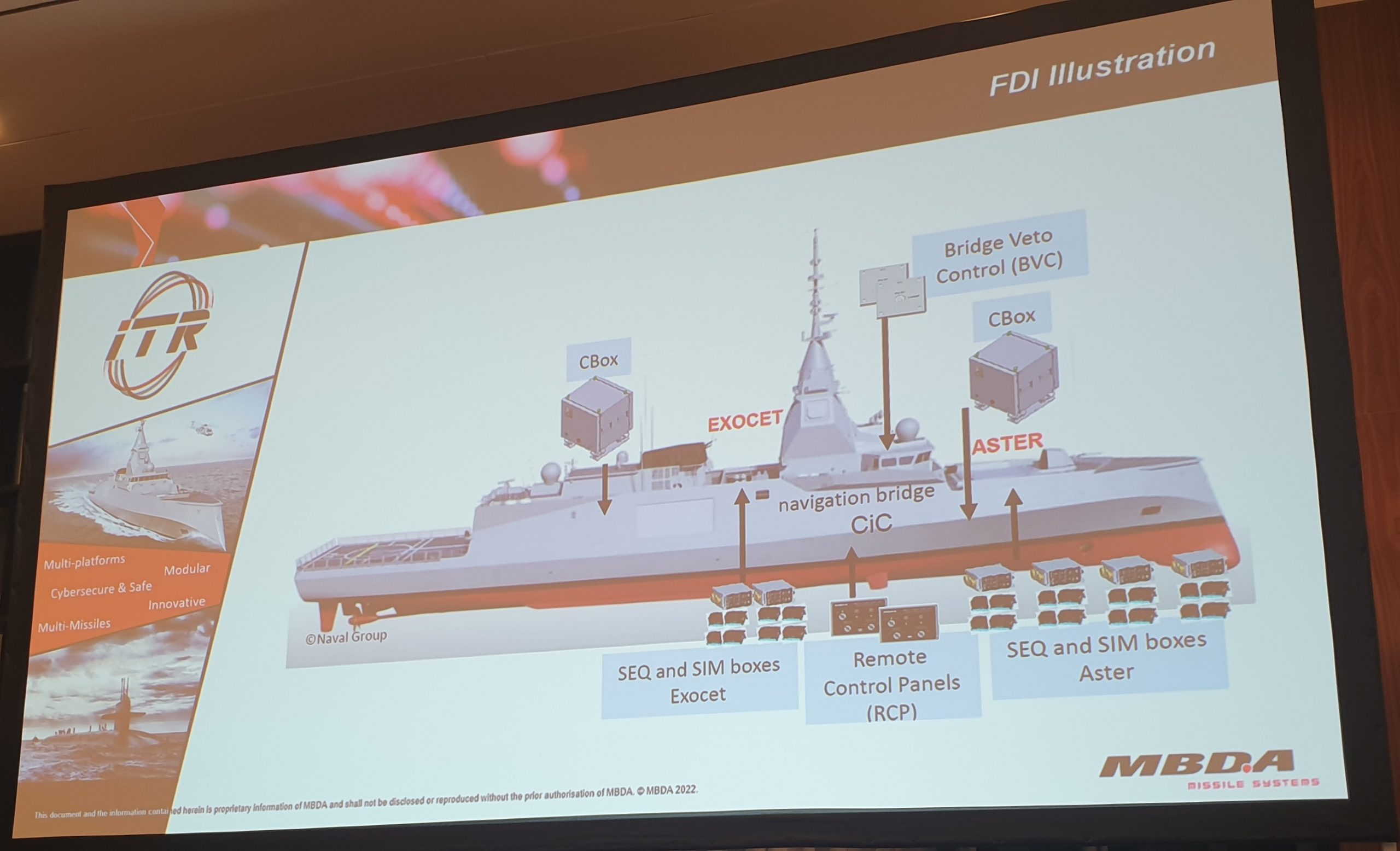 Από πλευράς MBDA είχαμε μια λεπτομερή ανάλυση της νέας φιλοσοφίας διασύνδεσης και διαχείρισης των οπλικών συστημάτων ενός πλοίου, η οποία αποτυπώνεται στο σύστημα Multi Missiles Firing Installation (ITR). To MMFU που θα εγκατασταθεί στις φρεγάτες FDI, περιλαμβάνει δύο σταθμούς διοίκησης και ελέγχου CBOX, δύο σταθμούς διαχείρισης αλληλουχίας πυρός SEQBOX για κάθε CBOX και ένα σταθμό διεπαφής SIMBOX για κάθε όπλο χωριστά με εξαίρεση τους ASTER 30 που μπορούν να συνδεθούν ανά δύο σε κάθε SIMBOX.