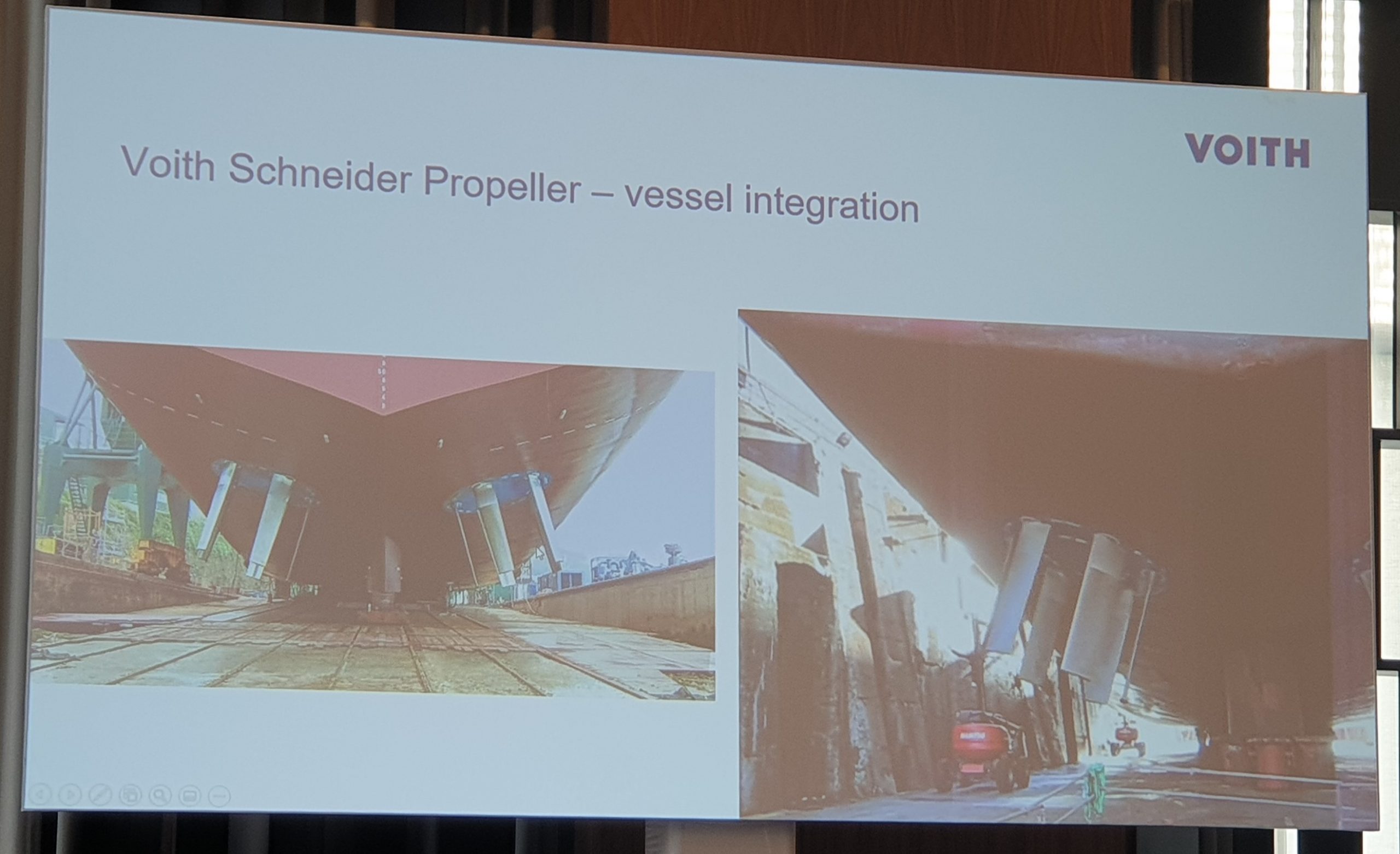 Η γερμανική εταιρεία Voith Schneider σε θεματική ενότητα παρουσίασε τη νέα κάθετης μορφής προπέλα, που πετυχαίνει εξοικονόμηση καυσίμου, βελτιωμένες επιδόσεις σταθερότητας σε κακό καιρό και αύξηση της μέσης ταχύτητας. Μπορεί δε να συνδυαστεί με την υδροδυναμική πτέρυγα της Hullvane για ακόμη καλύτερες επιδόσεις. Σε ερώτησή μας εάν το μήκος των λεπίδων είναι απαγορευτικός παράγοντας για επιχειρήσεις σε παράκτια ύδατα, ο Κος Dirk Juergens, επισήμανε πως μπορούν να τοποθετηθούν πιο κοντές με διαφορετικό πλήθος και γεωμετρία, χωρίς αυτό να επηρεάζει την απόδοση του συστήματος.