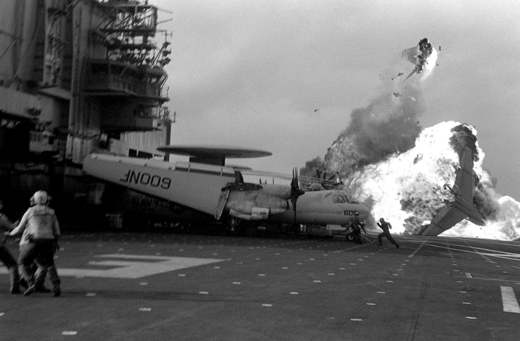 ‘Wave off! Wave off! Wave off!’ Ο χειριστής του Corsair αγνοεί τo σήμα του LSO (Landing Signal Officer) να ματαιώσει την προσνήωση και συνεχίζει ακάθεκτος για το κατάστρωμα. Το A-7E (BuNo 157495) της Μοίρας VA-56 ‘Champions’ χτυπά με ορμή στο πίσω μέρος του αεροπλανοφόρου USS Midway και διατρέχει τμήμα του καταστρώματος πτήσεων μεταμορφωμένο σε ένα ποτάμι φωτιάς.
