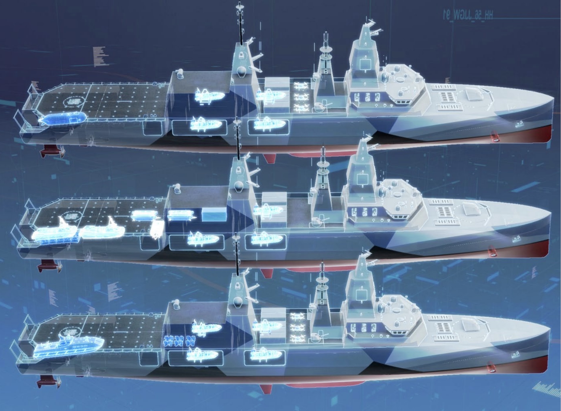Στο πνεύμα της εποχής, η Adaptable Strike Frigate στηρίζεται βέβαια στην εξαπόλυση και περισυλλογή κάθε είδους αυτόνομων μη επανδρωμένων συστημάτων. Οπότε ενισχύει την εικόνα της επιχειρησιακής κατάστασης, ακόμη και πολύ βαθιά στην εχθρική ενδοχώρα, ενώ μπορεί να ανταποκριθεί σε απειλές που προσεγγίζουν καλυπτόμενες από το παράκτιο ανάγλυφο.
