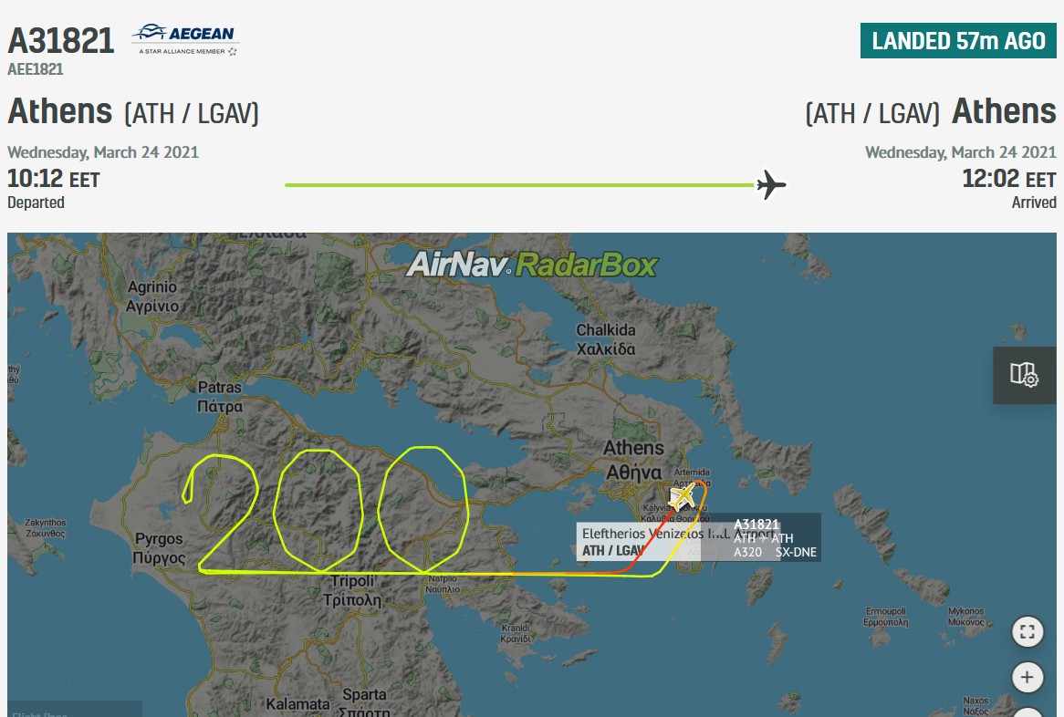 Με ένα Airbus Α320, με συμβολικό κωδικό Α3 1821, η Aegean τίμησε την Ελληνική Επανάσταση με “αεροπορικό” τρόπο. Έτσι η πτήση ξεκίνησε από το Ελ. Βενιζέλος, έφτασε στην Αχαΐα και από εκεί ξεκίνησε να σχηματίζει το 200 (ως αποτύπωμα του ίχνους της), πετώντας πάνω από την Αρχαία Ολυμπία, τα Καλάβρυτα, την Κόρινθο, το Άργος και τα Δερβενάκια.