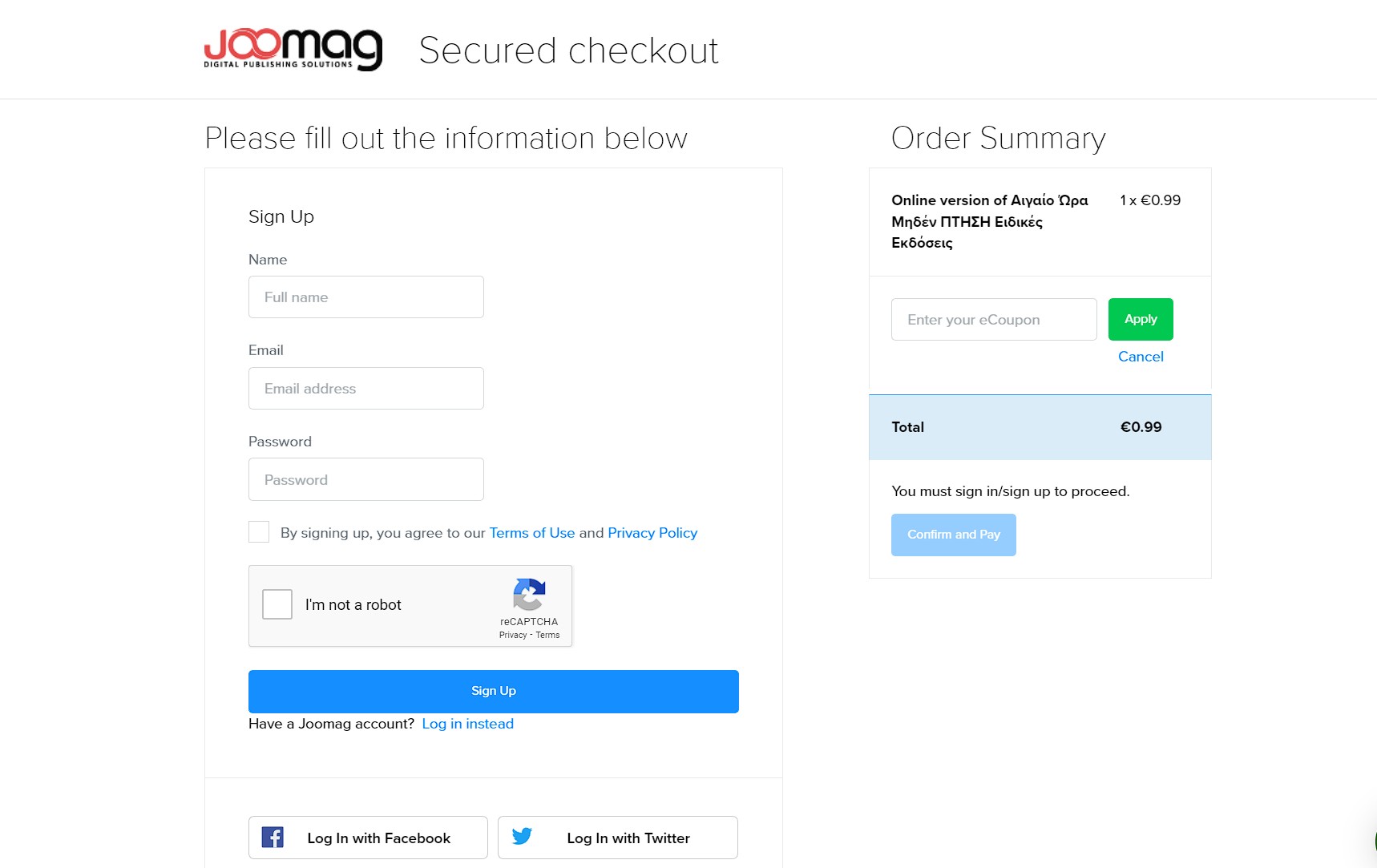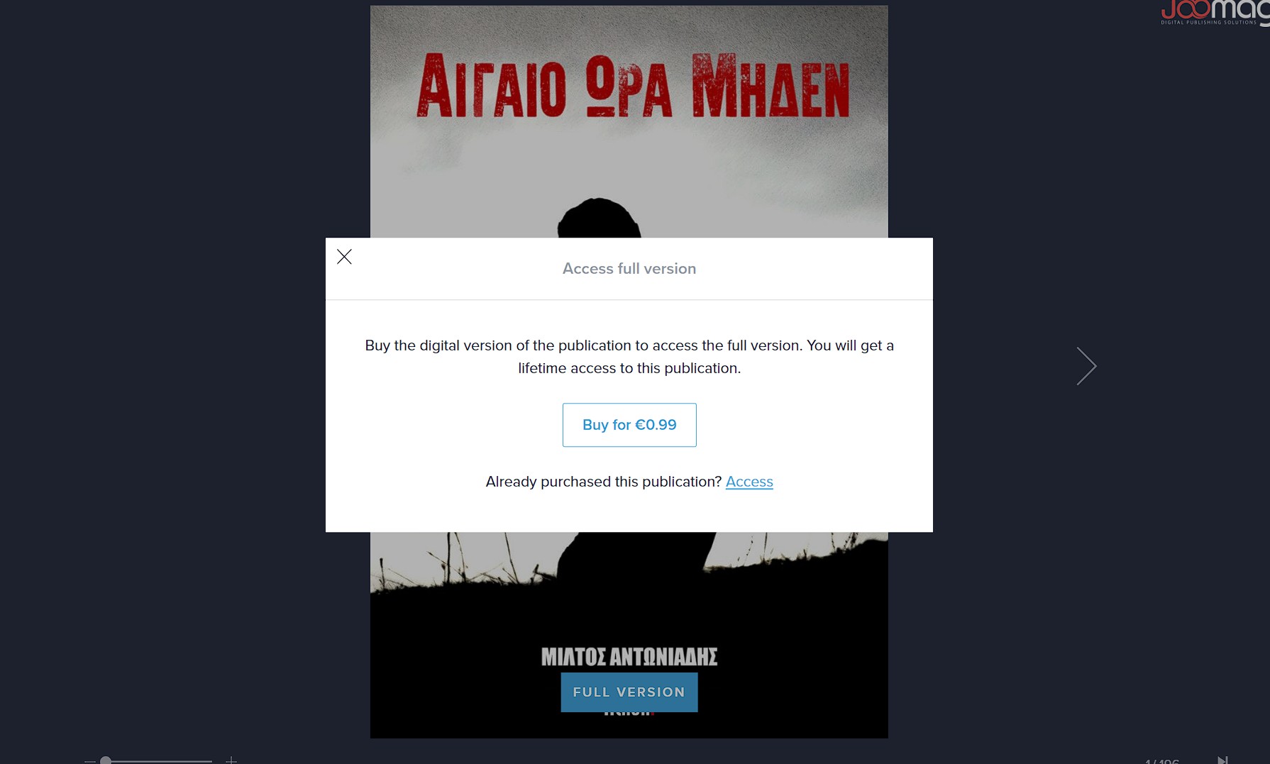 Πως θα το αποκτήσετε; Κάντε κλικ στον σύνδεσμο της πλατφόρμας Joomag και θα δείτε τις πρώτες σελίδες του διηγήματος. Πατήστε το κουμπί στο κάτω μέρος που γράφει FULL VERSION και στη συνέχεια κάντε κλικ στο παράθυρο που λέγει “Buy for €0,99”.