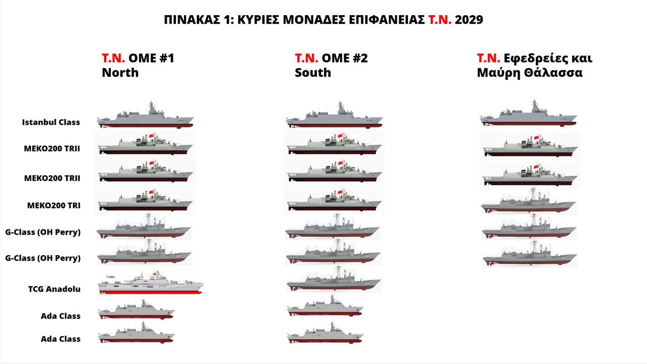 Ώρα 21:20: Στη γέφυρα της φρεγάτας “Κίμων”, τύπου FDI HN, ναυαρχίδας της Ομάδας Μάχης #1, o πλοίαρχος Μπούρλας, διοικητής της ομάδας μάχης, μελετάει τις τελευταίες φωτογραφίες από τον γαλλικό δορυφόρο που δείχνουν τη διάταξη των πλοίων της τουρκικής ομάδας μάχης απέναντί του. Οι φωτογραφίες τραβήχτηκαν μόλις δύο ώρες νωρίτερα. Οι Τούρκοι δεν έχουν αλλάξει διάταξη. Ο παλαιότερες φρεγάτες G-Class προπορεύονται, ενώ το Anadolu πλέει στη μέση της ομάδας του πλαισιωμένο από 3 ΜΕΚΟ και μια Istanbul. Η τελευταία πλέει στα πρύμα του Anadolu. Τον πλοίαρχο απασχολούν οι 16 αντιπλοϊκοί πύραυλοι ATMACA και οι 64 αντιαεροπορικοί HISAR αυτού του πλοίου. Επόμενες προτεραιότητες στοχοποίησης οι τουρκικές ΜΕΚΟ. Το Anadolu μπορεί να το τακτοποιήσει και με πυροβόλα εφόσον θα έχει σακατέψει πρώτα τη συνοδεία του. Ο γρίφος που πρέπει να λύσει ο πλοίαρχος είναι πώς θα περάσουν αρκετά βλήματα από τις ζώνες αντιαεροπορικής άμυνας των Τούρκων. Ξανακάνει τους λογαριασμούς του: